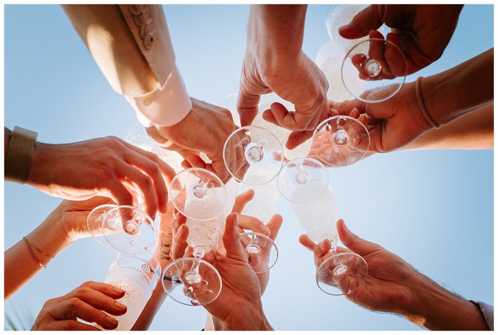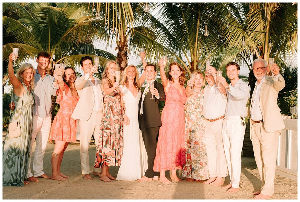 As the sun softened into gold, the ceremony began, officiated by the groom’s father. It was intimate and deeply personal; vows carried on the breeze, waves offering a gentle rhythm underneath every word. With family looking on and light wrapping around them, it was everything a Bahamian sunset ceremony should be: warm, sincere, unforgettable. Guests were invited to take part in a wishing ceremony—placing a shell into a vessel while speaking a wish for the couple. One by one, blessings gathered like tide-washed treasures. Winter captured the movement of hands, the smiles, and the small, glistening details that make a tradition feel timeless.